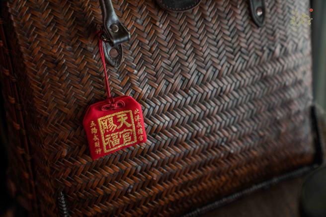 以每年財神祖廟眾人瘋搶的天官賜福錢母紅包為原型,金蔥電繡而成,大紅討喜,隨攜保平安。