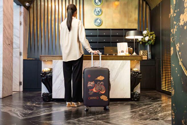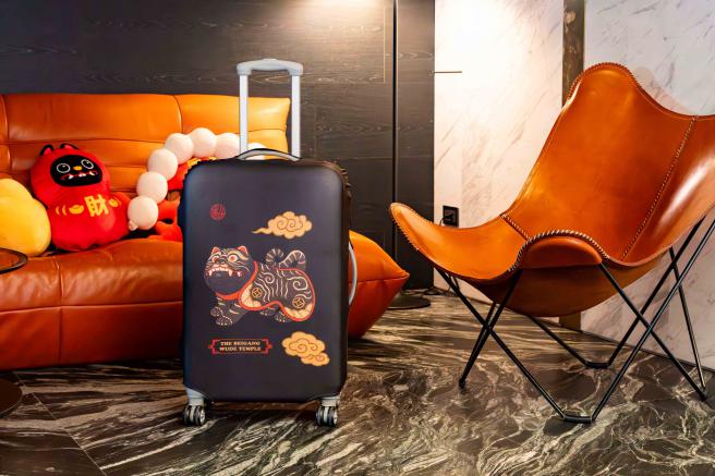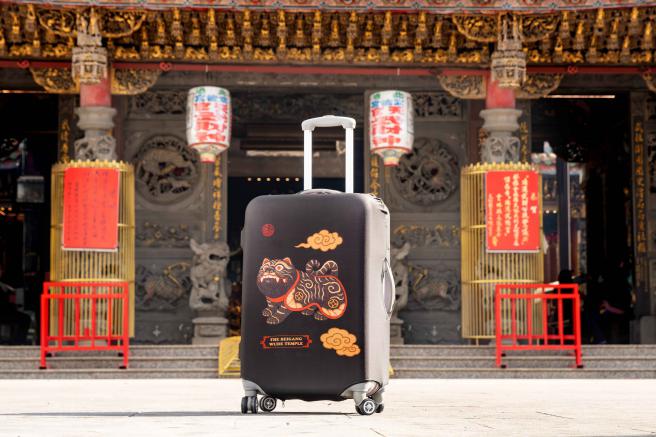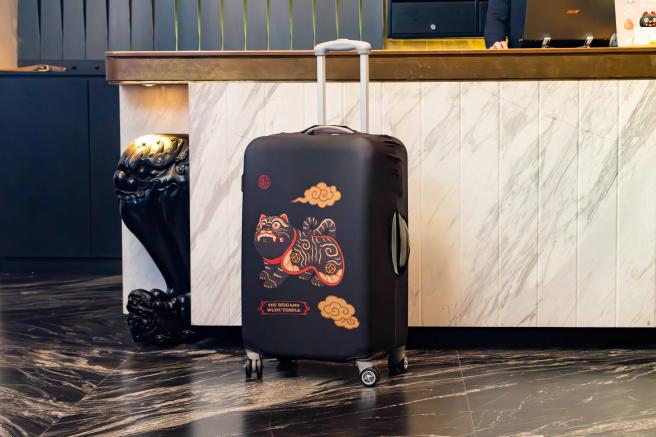 黑虎行李箱套印花以祖廟黑虎將軍的形象繪製而成,守護你的每段旅程。彈性布料貼合包覆保護行李箱,防塵易穿脫,且遠遠就能夠快速辨識,黑虎隨行,出門更安心,一路順行。