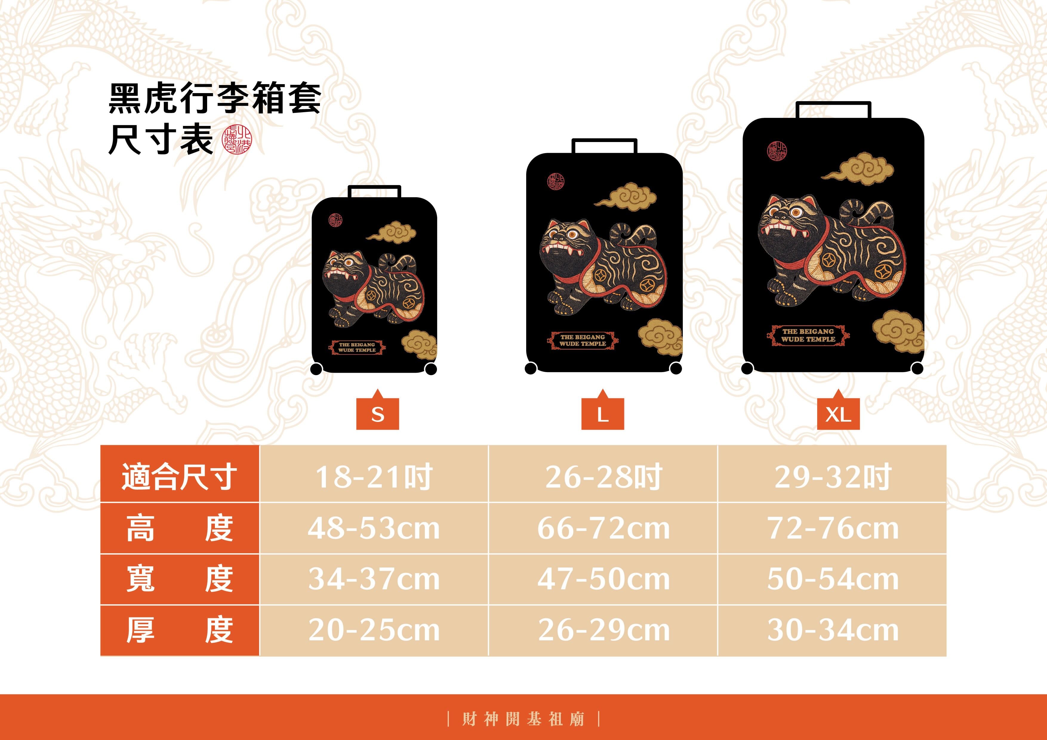 黑虎行李箱套印花以祖廟黑虎將軍的形象繪製而成,守護你的每段旅程。彈性布料貼合包覆保護行李箱,防塵易穿脫,且遠遠就能夠快速辨識,黑虎隨行,出門更安心,一路順行。